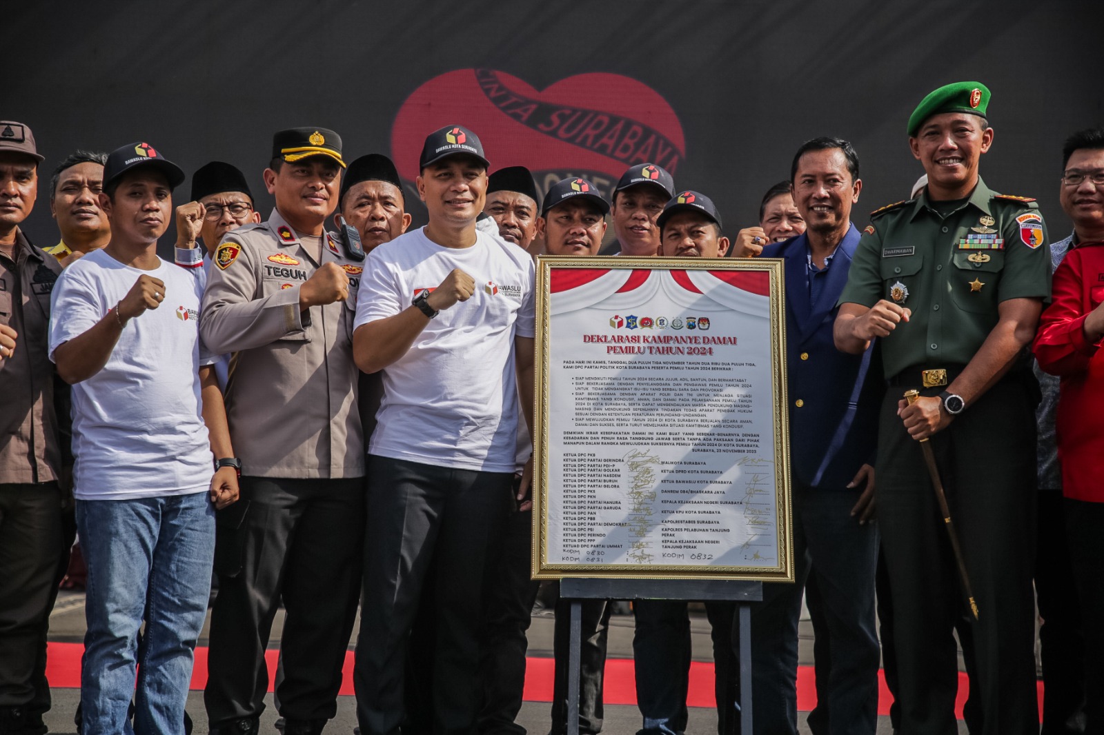 NEWS TIMES: Pemerintah Kota (Pemkot) Surabaya bersama Forum Koordinasi Pimpinan Daerah (Forkopimda) siap mendukung penuh penyelenggaraan Pemilihan Umum (Pemilu) Tahun 2024 yang aman, damai dan kondusif. Hal tersebut sebagaimana termaktub dalam ikrar bersama Deklarasi Pemilu Damai 2024 di Halaman Balai Kota Surabaya, Kamis (23/11/2023).