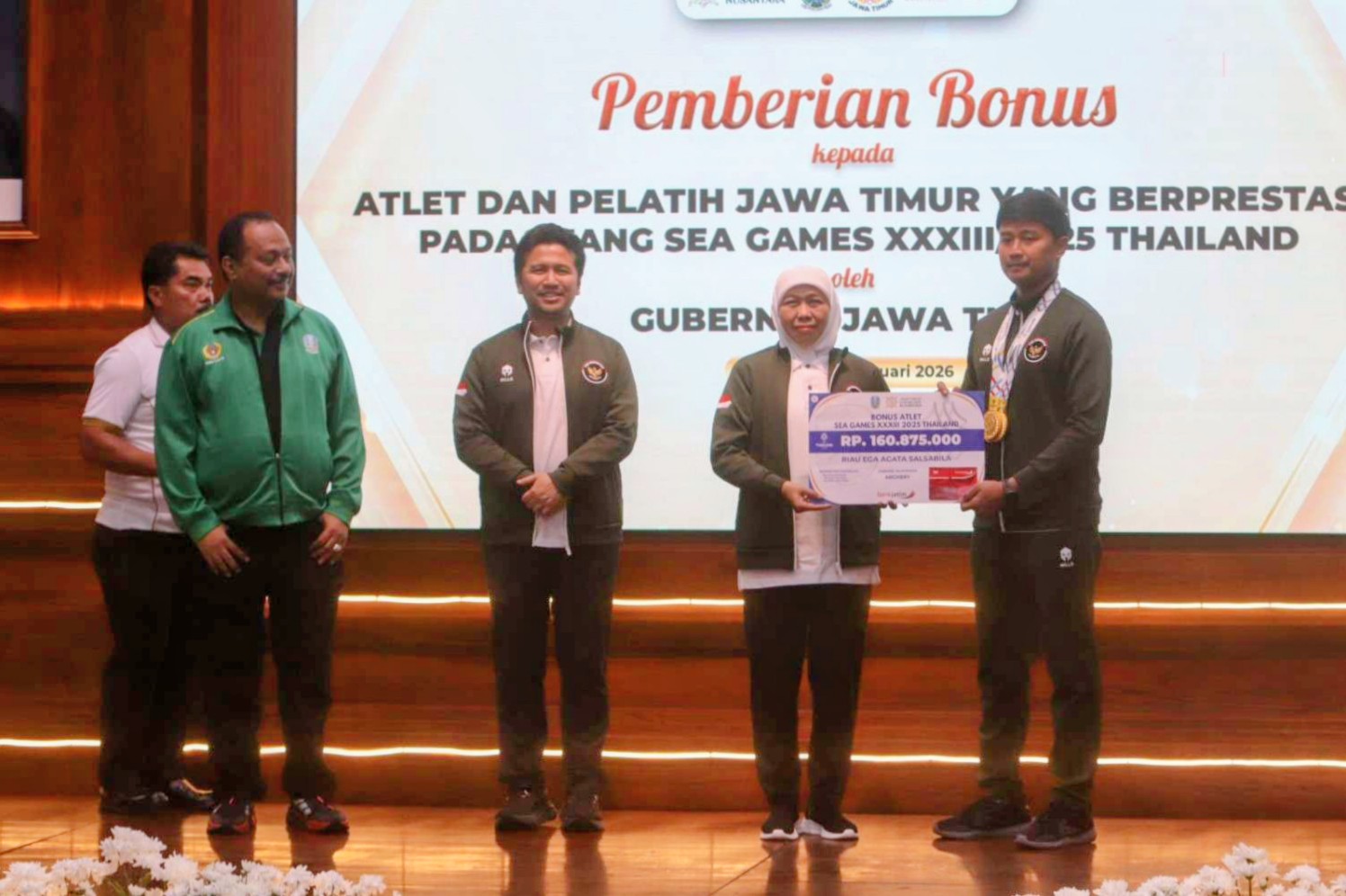 NEWS TIMES – Gubernur Jawa Timur Khofifah Indar Parawansa memberikan bonus kepada atlet dan pelatih yang berkontribusi menyumbangkan medali bagi Indonesia pada ajang SEA Games 2025 Thailand. Penyerahan bonus digelar di Gedung Negara Grahadi, Surabaya, Jumat (30/1/2026), sebagai bentuk apresiasi atas prestasi atlet Jawa Timur di level internasional.