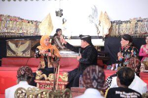 Pada kesempatan tersebut, di tengah adegan limbukan, Gubernur Khofifah menyempatkan menyapa ribuan masyarakat yang hadir sekaligus berdialog santai bersama Cak Kirun dan Cak marwoto.