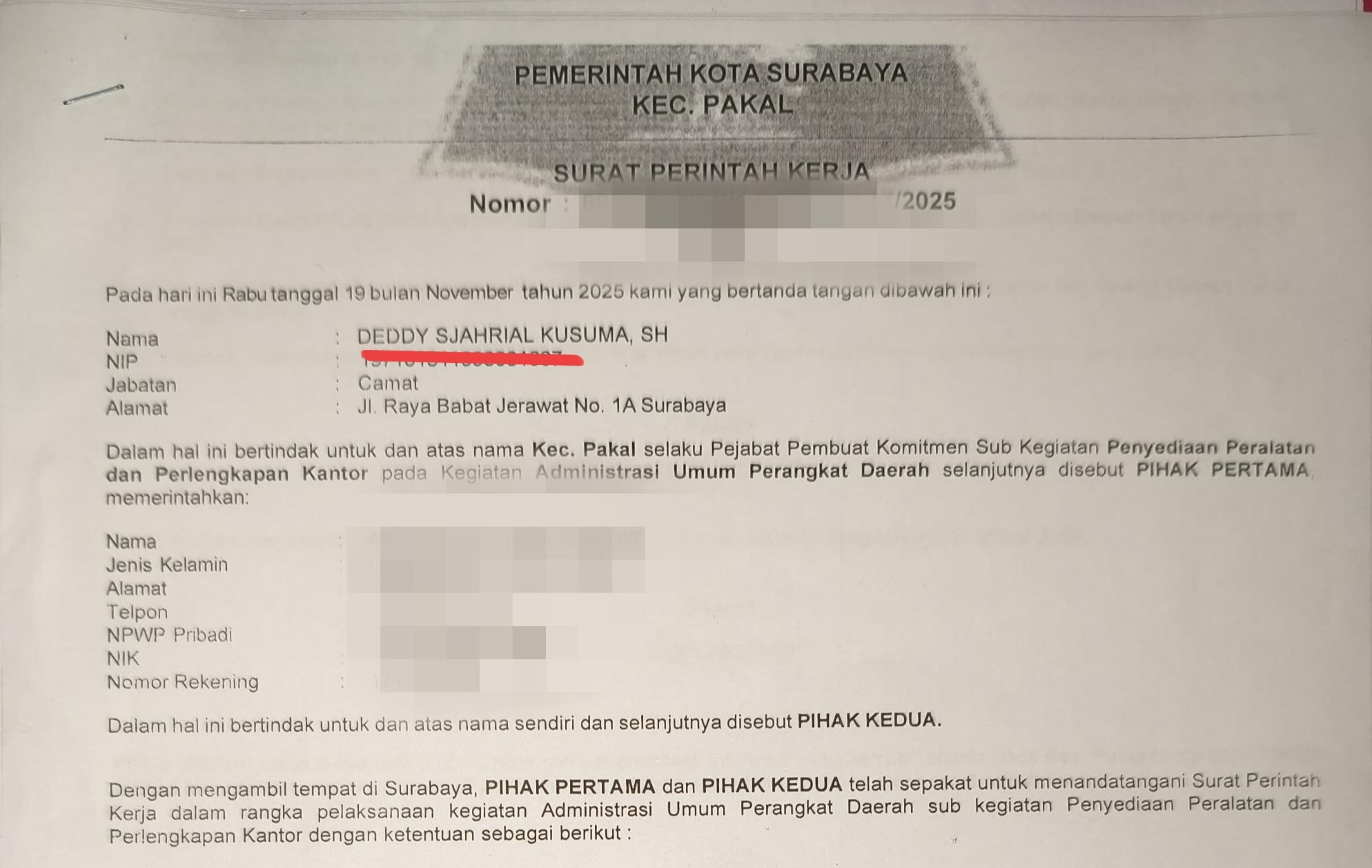 Selain itu, SPK nomor 800/1240/SPK-OP/436.9.17/2025 tertanggal 19 November 2025 yang diberikan oleh mantan Camat Deddy menggunakan dokumen berlogo dan bertulisan Pemerintah kota kecamatan Pakal Surabaya.