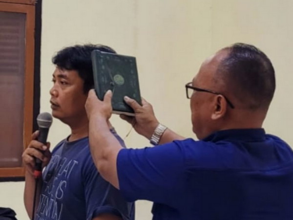 NEWS TIMES, Surabaya – Seorang pengunjung Pengadilan Negeri (PN) Surabaya terlihat mengangkat kitab suci tepat diatas kepala seorang saksi dari petugas kepolisian yang berlangsung disumpah oleh Ketua Majelis Hakim Alex, saat sidang beragenda memberikan keterangan kesaksian di persidangan di ruang Garuda 1 PN Surabaya, Selasa (23/04/2024).