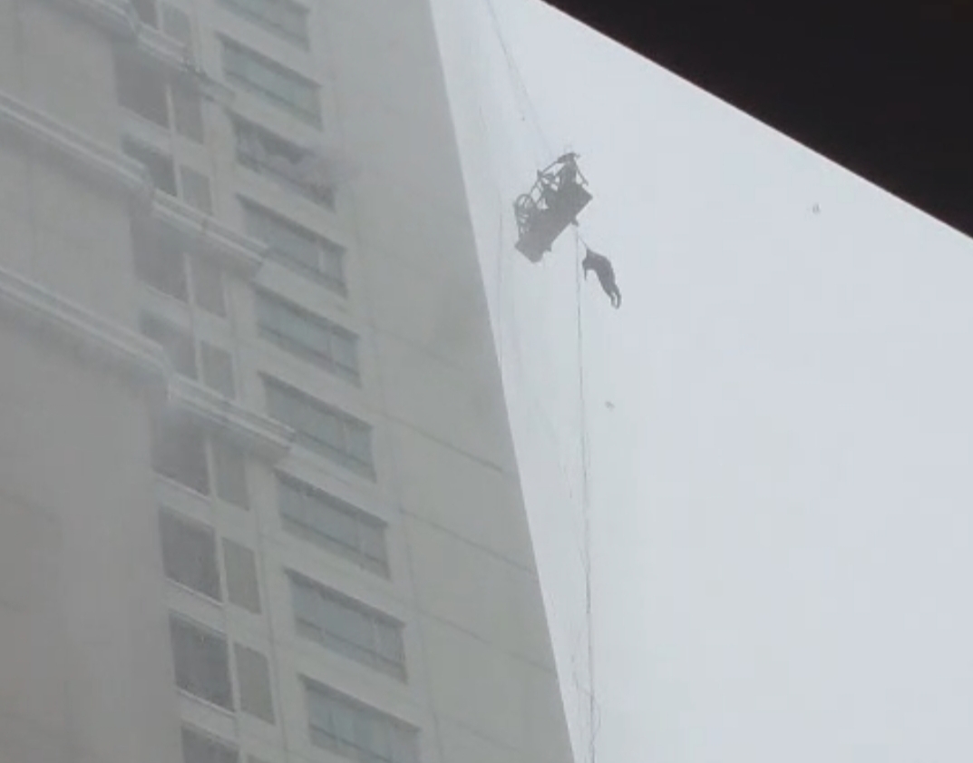 Peristiwa tersebut terjadi saat dua pekerja tengah melakukan aktivitas di ketinggian menggunakan gondola atau suspended scaffolding. Namun, cuaca ekstrem yang tiba-tiba melanda kawasan tersebut membuat perancah gantung itu tak stabil.